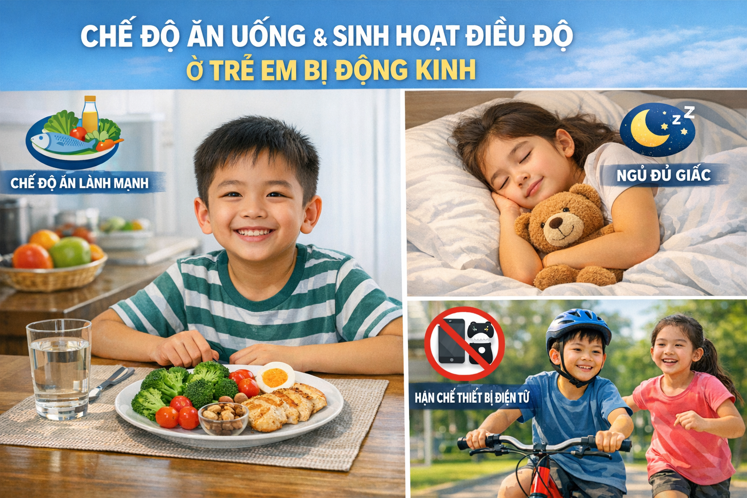 Vì vậy, các biện pháp như dùng thảo dược, châm cứu, xoa bóp bấm huyệt, dưỡng sinh hay điều chỉnh chế độ ăn uống, sinh hoạt được xem là hướng hỗ trợ giúp an thần, cải thiện giấc ngủ, giảm căng thẳng và tăng sức đề kháng. Việc phối hợp hợp lý giữa Tây y và Đông y, cùng với lối sống lành mạnh và tái khám định kỳ, có thể góp phần nâng cao hiệu quả kiểm soát bệnh và cải thiện chất lượng cuộc sống của bệnh nhân động kinh.